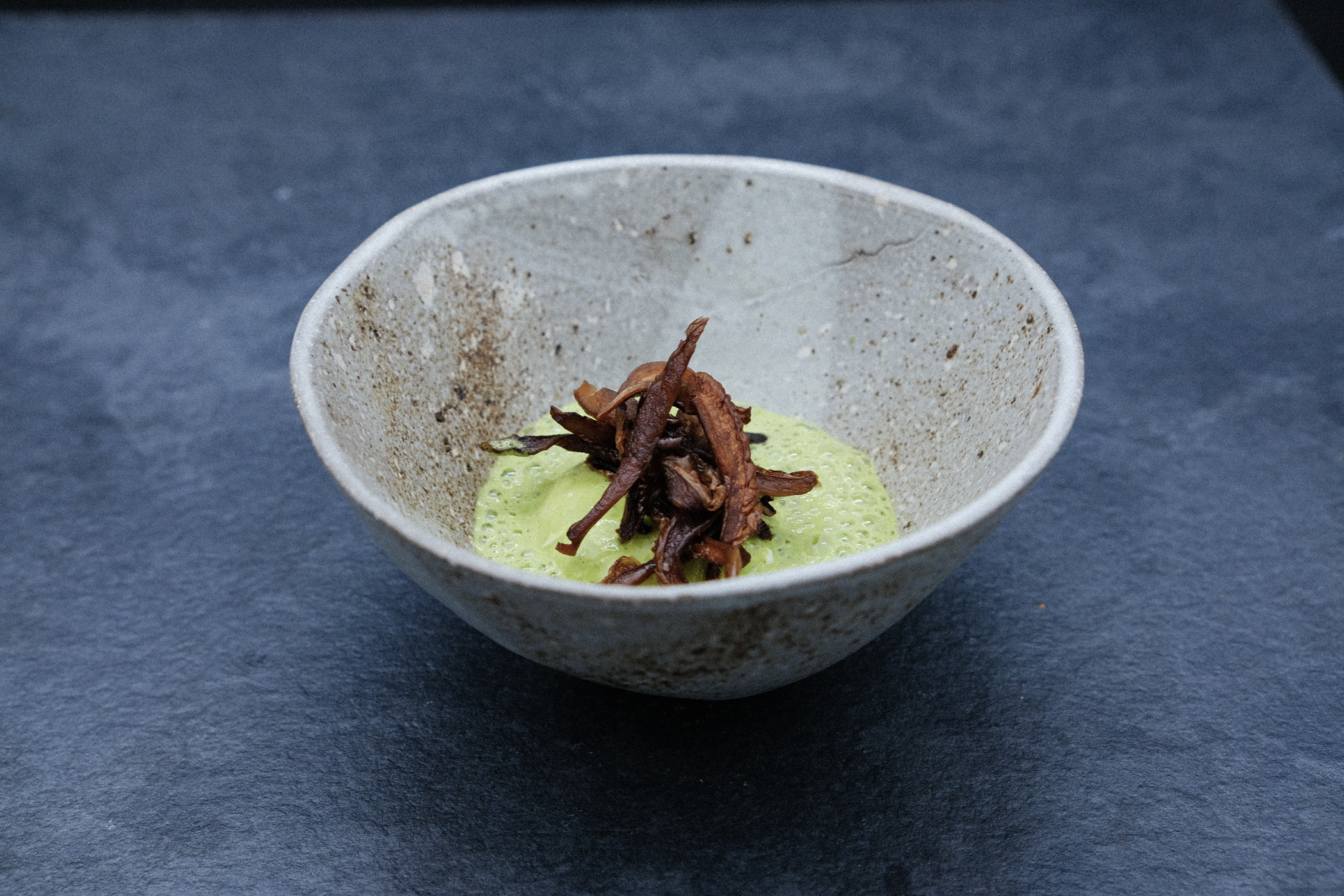 Le chef étoilé Thierry Schwartz revisite ici un grand classique avec justesse et raffinement : un œuf poché aux herbes, délicatement nappé d’une crème aux herbes fraîches, accompagné de pleurotes grillées aux accents boisés. Entre fraîcheur aromatique et textures contrastées, cette création rend hommage à la nature et à la subtilité des saveurs végétales.